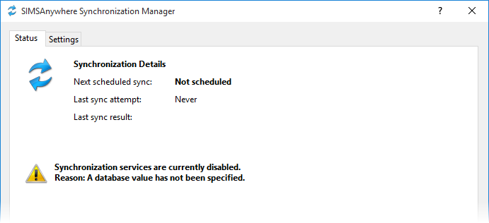 If the SIMSAnywhere Synchronization Service (SASS) configuration file becomes corrupted, configuration changes made from SIMSAnywhere Synchronization Manager (SASM) may appear to save successfully but are not actually retained by SASS. When this occurs, the Status tab in SASM will report that synchronization services are disabled because a database value has not been specified, and the message persists even after you provide a database value from the Settings tab.